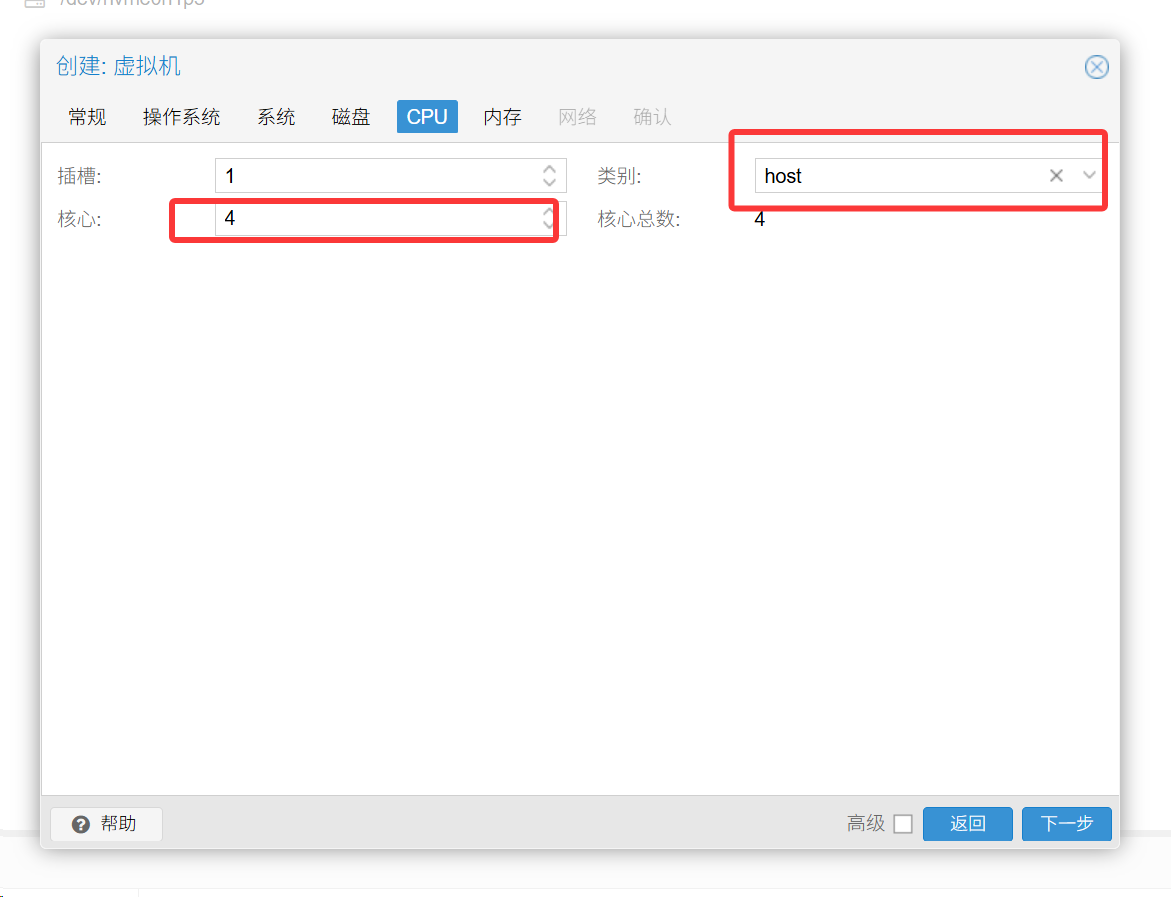 核心改成4核,类型为host