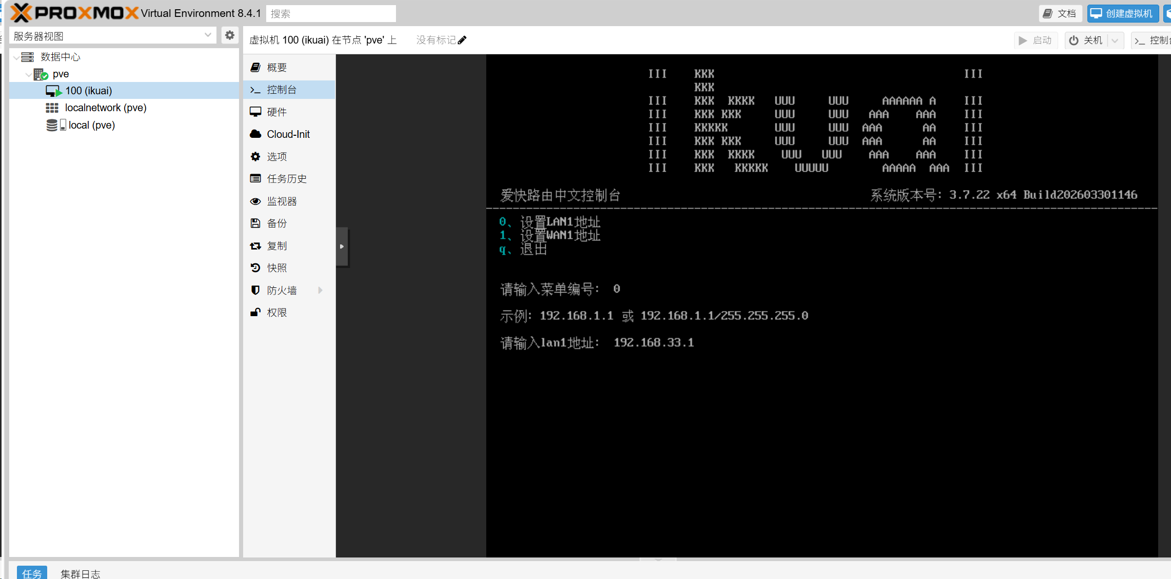 输入0回车,lan口地址改为192.168.33.1然后回车(这个地址可以和我不一样,例如192.168.3.1之类的)