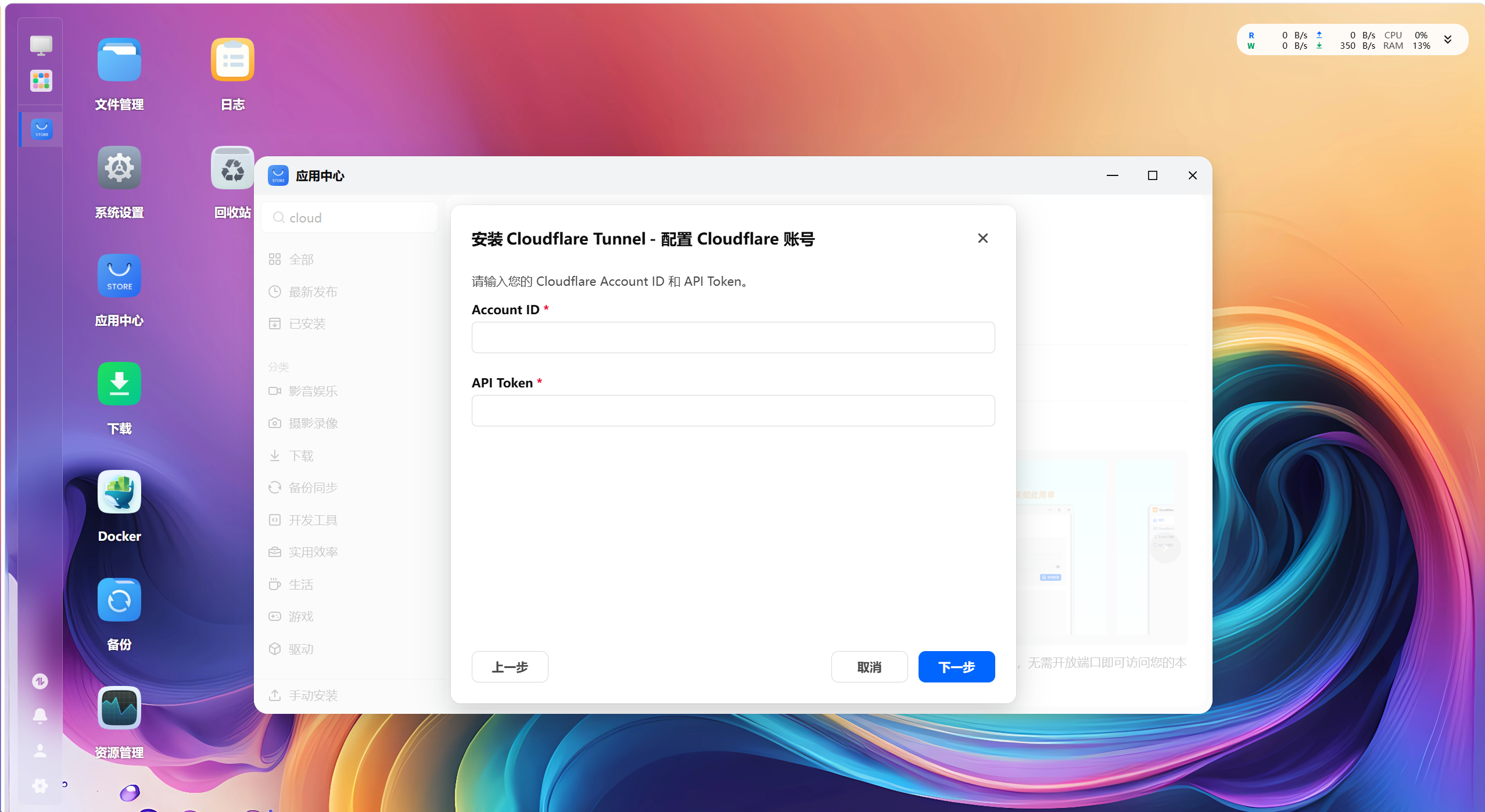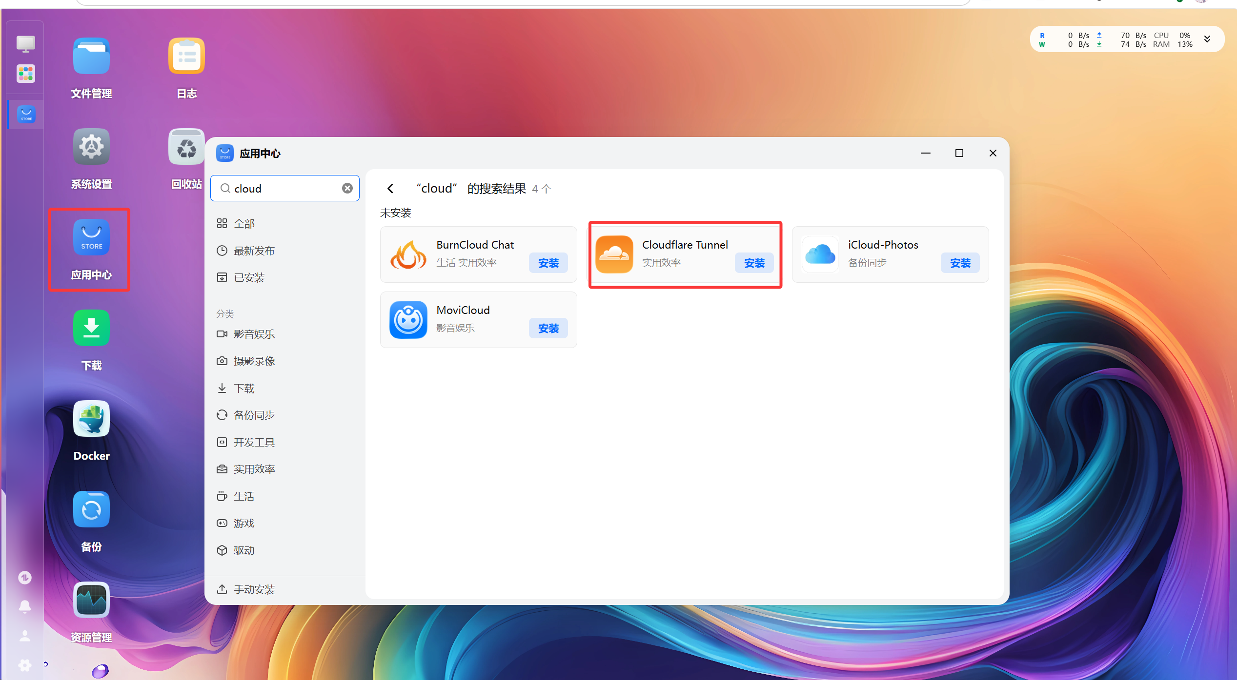 应用中心,Cloudflare Tunnel应用点击安装