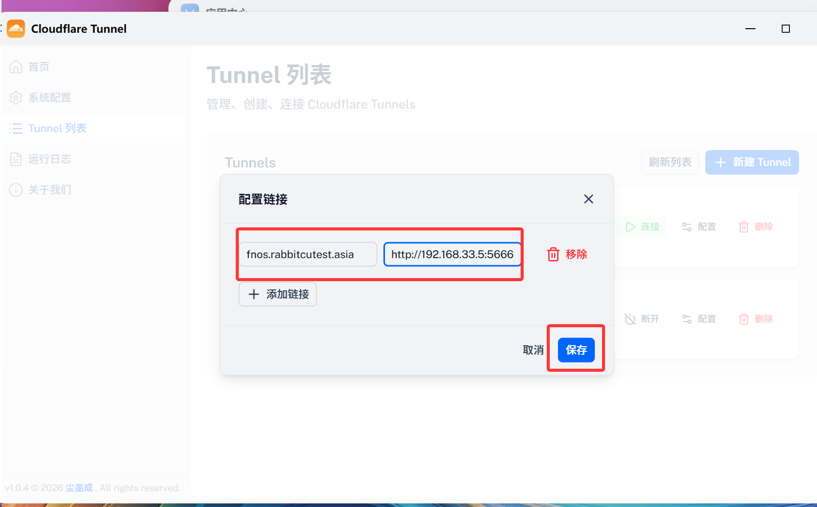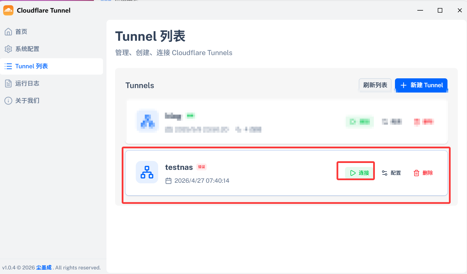 然后连接你刚刚创建的Tunnel(我这边同账号下已经有一个了,正常而言都是第一个,点击连接)