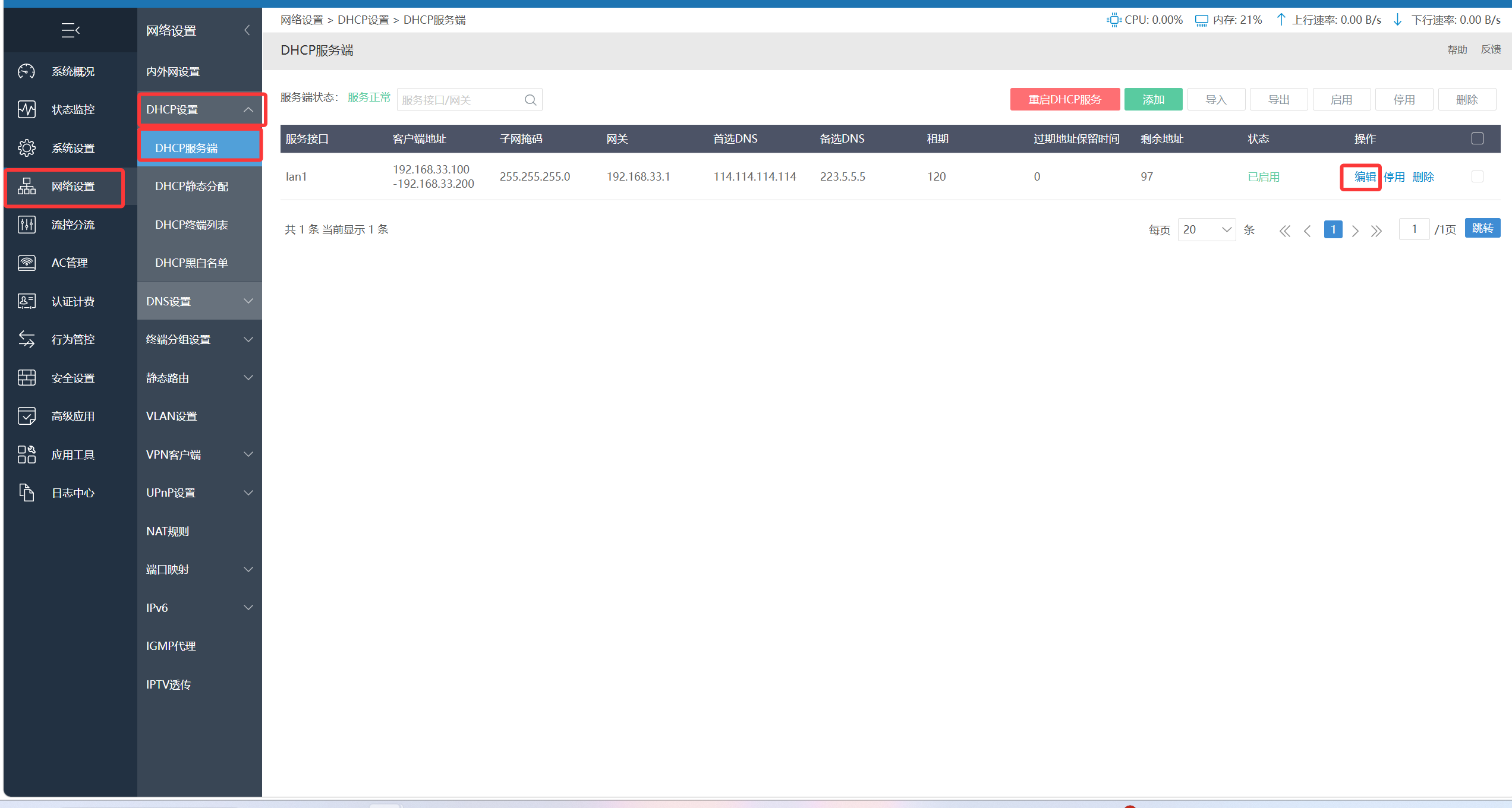 Openwrt配置好之后,需要设置ikuai的DHCP,把dns和王关指向Openwrt打开ikuai——网络设置——DHCP设置——DHCP服务端——编辑将网关和首选DNS改为192.168.33.2,然后点击保存或者你还有其他的方案,例如