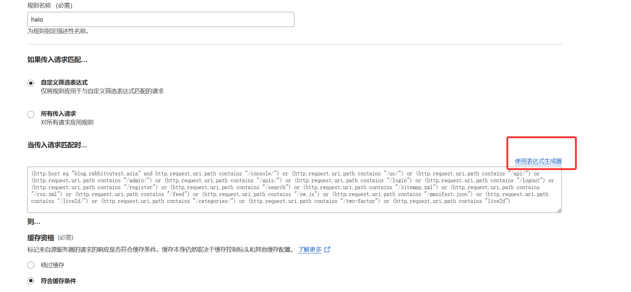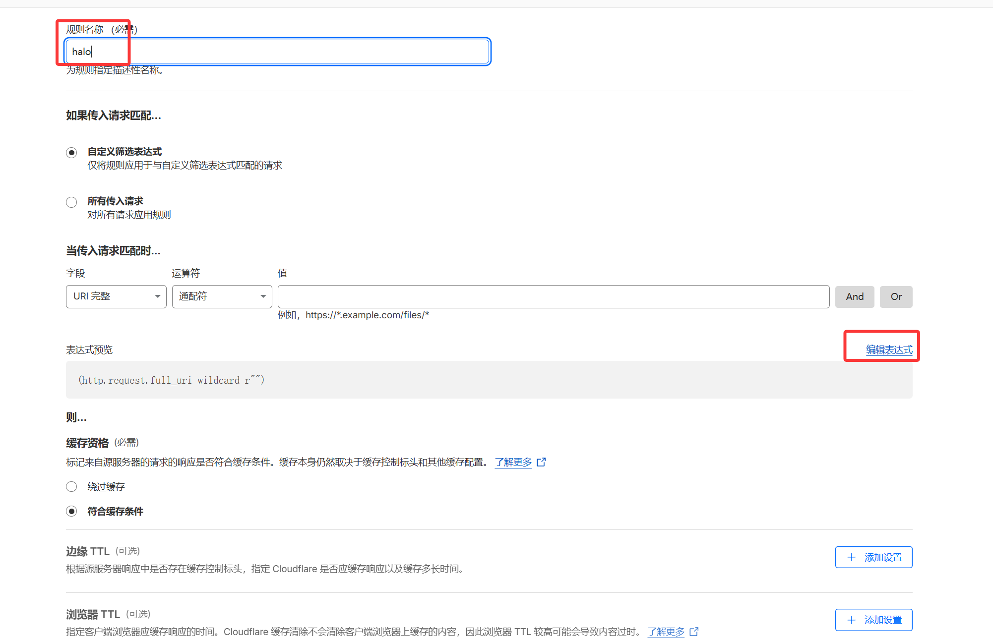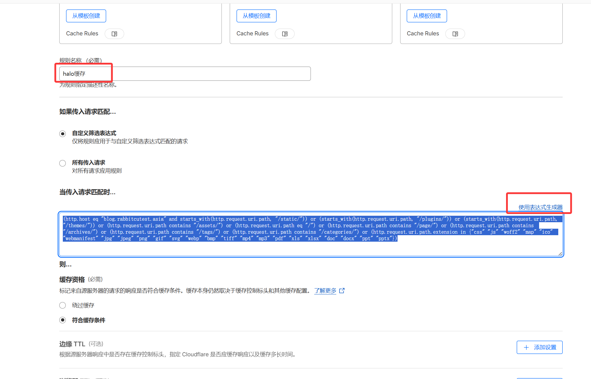 然后再次点击创建缓存规则 如下图填写名称,表达式生成器,将下边内容复制粘贴进去
